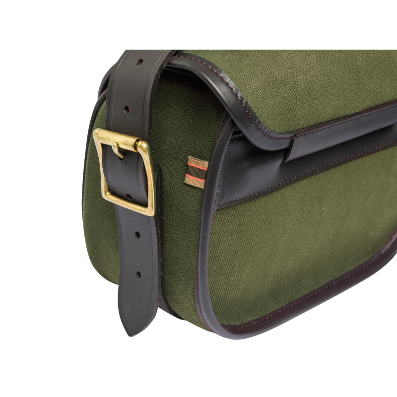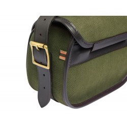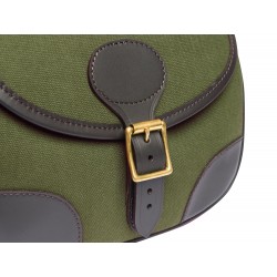 Torba na amunicję wykonana z bawełnianego płótna i skórzanych paneli, zamykana na klapę.