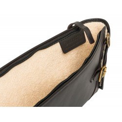 Biała wewnętrzna podszewka ze sztucznego futra. Mosiężne dodatki, sprzączki i nity.