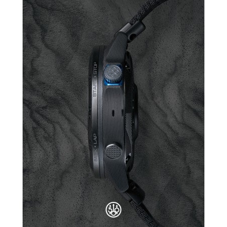 Taktyczny design z lekką i wytrzymałą kopertą o średnicy 46 mm z włókna węglowego Fused Carbon Fiber i bezelem z mikroradełkowanymi przyciskami oraz misternym nylonowym paskiem o splocie żakardowym
